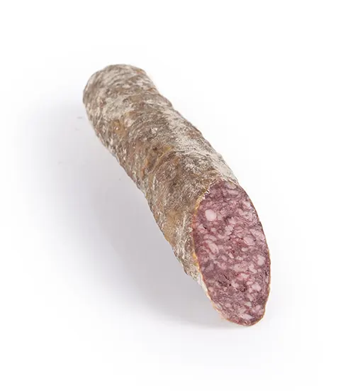 - El Salchichón Ibérico de Bellota es un embutido curado elaborado a partir de las mejores carnes de nuestros cerdos ibéricos alimentados con bellotas. Se adereza con especias suaves como la pimienta y el nuez moscada, lo que le otorga un sabor delicado y elegante. Este producto es un pilar tradicional como joya de la charcutería ibérica.